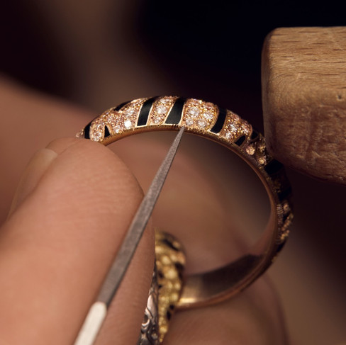 다이아몬드를 파베 세팅한 제품에는 링의 가장자리에 정교하게 조각하는 ‘사우전드 라인(thousand line)’ 기법으로 섬세한 텍스처를 더했다. 블랙 래커로 표현한 모티프 역시 수작업으로 처리되어 정교함이 돋보인다.
