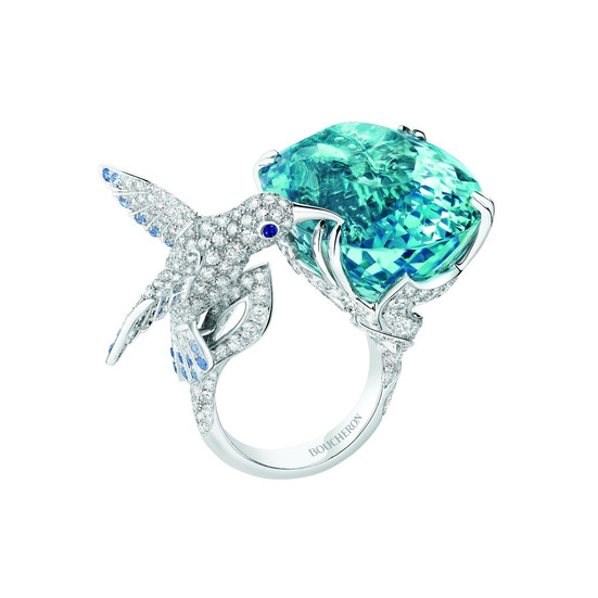 아요 어데버리와 부쉐론의 '오피, 허밍버드' 링, 블루 인피니 이어링.